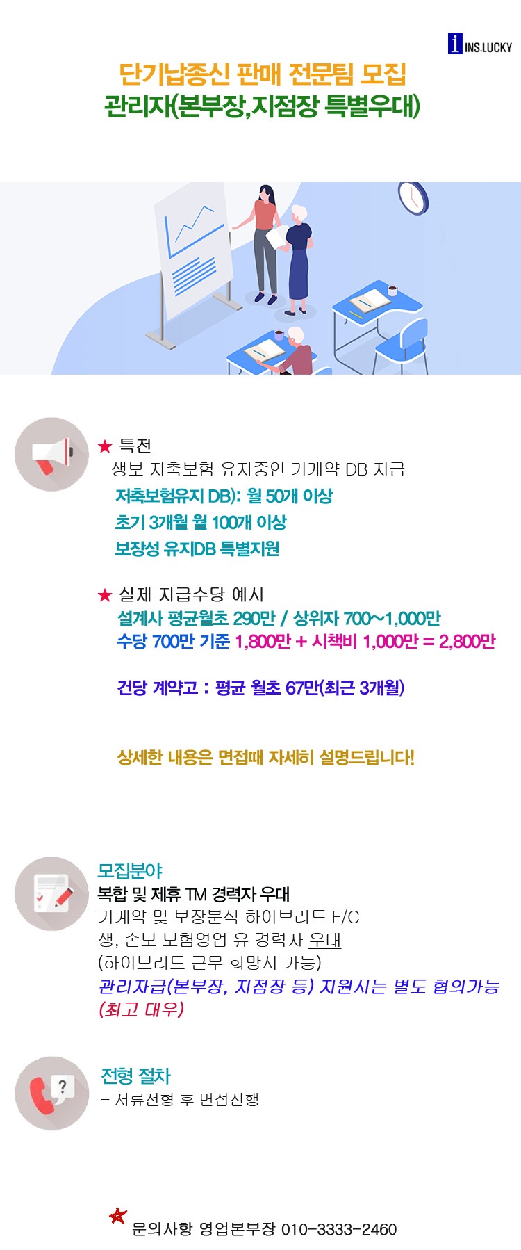 #기계약 DB제공 #초기 3개월 월 100개이상 #단기납종신 판매 전문팀을 모집 #본부장,지점장 특별우대