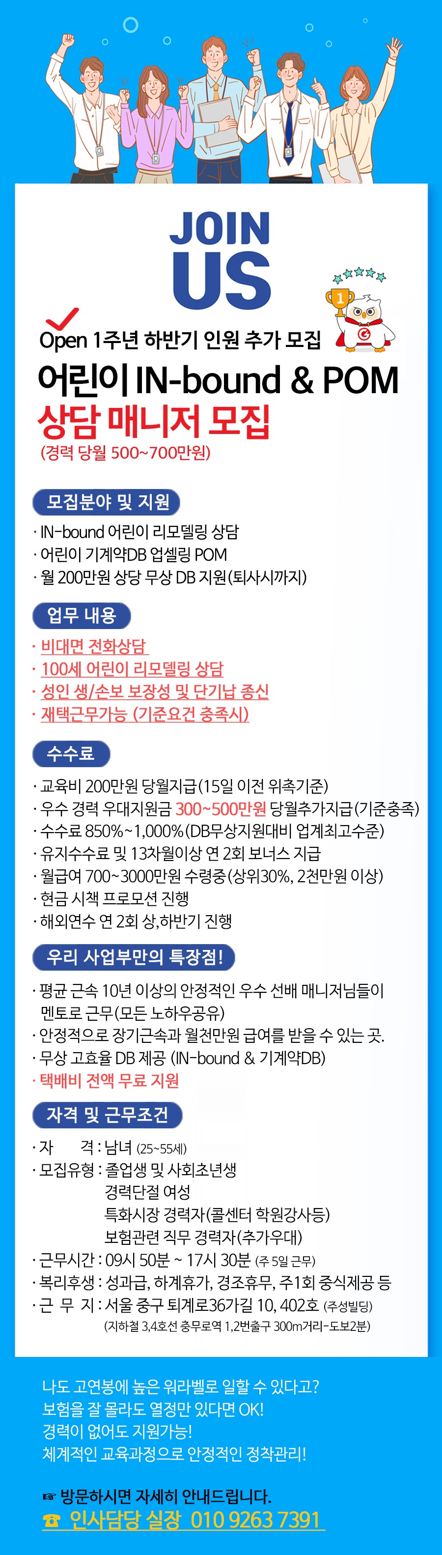 #교육비 당일 100만원 지급 #성과급 #하계휴가 #고효율 DB 제공 #경조휴무 #주1회 중식제공
